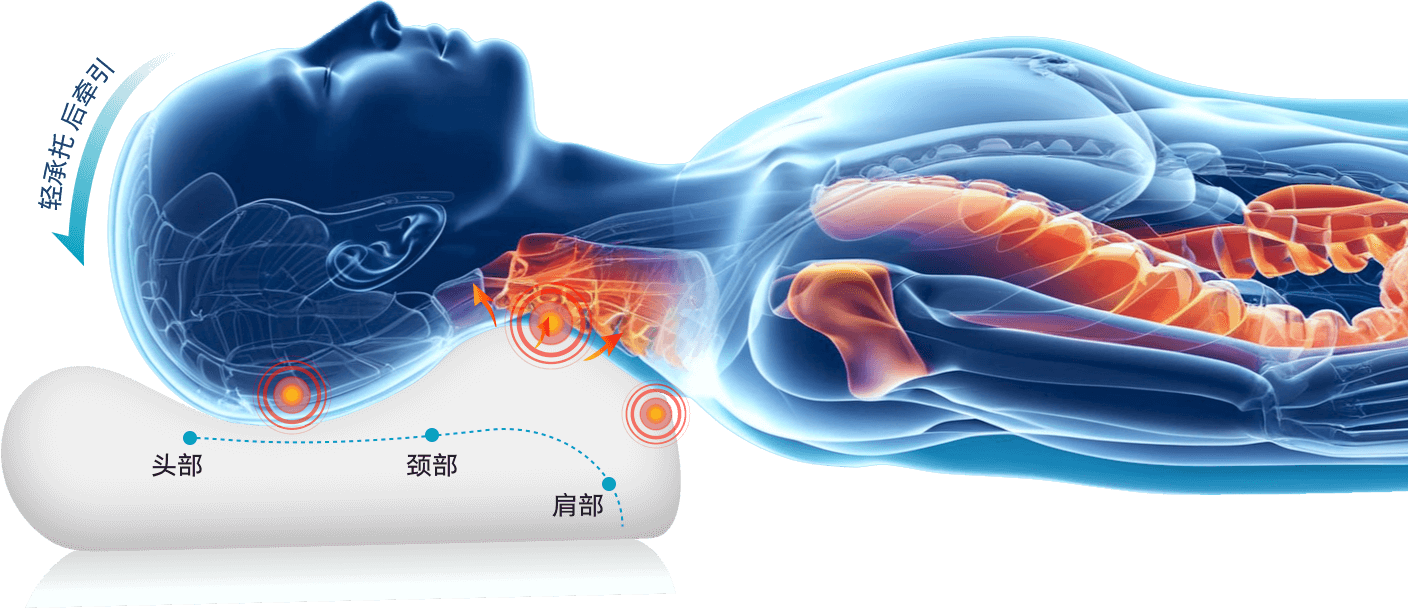 一枕两高的高低R角/贴合人体肩部的蝴蝶型设计, 贴合人体肩颈,结合凝胶材质特性,既有固体支 撑又有液态的柔软适应性,全面支撑,柔软贴合。